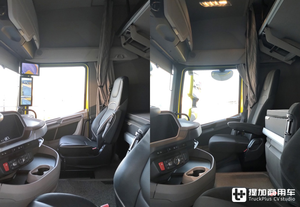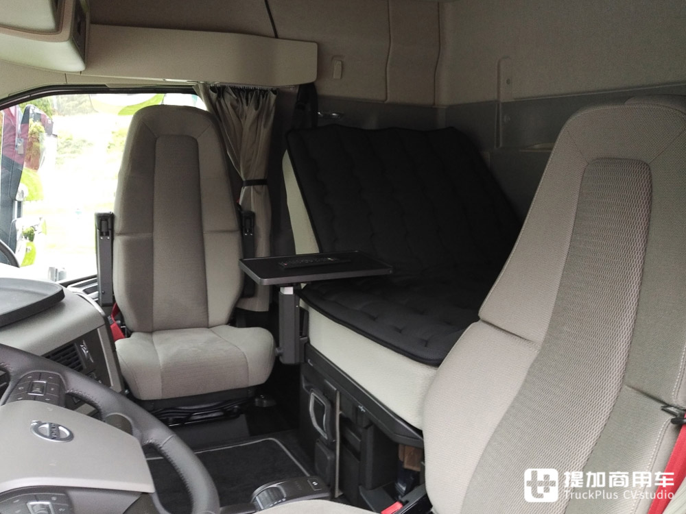 在沃尔沃这里,所有的加长区域都给了卧铺,让卧铺的宽度来到了105厘米。同时,配合可旋转的副驾驶座椅,加上折叠小桌板,让驾驶室内更具家的感觉。斯堪尼亚加大驾驶室的内部布局与其类似,但伸缩床为内部带来了更多灵活性。不可否认的是,沃尔沃为后来者提供了更多的经验。