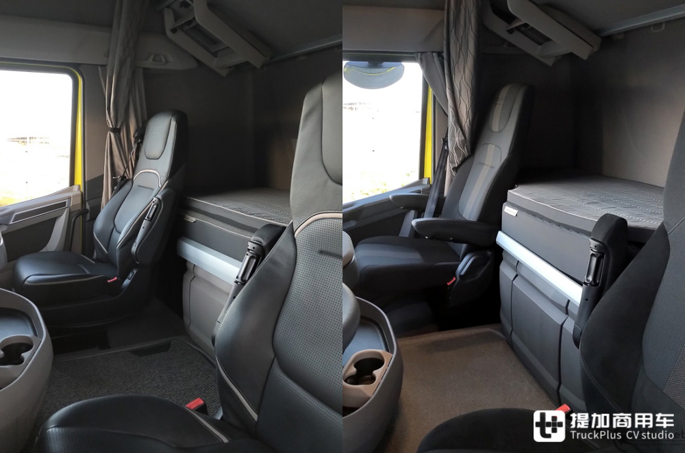 相比于上图的CS20H驾驶室来说,驾驶室的后壁、侧壁被整体后移,那些固定在后壁上的设备也随驾驶室后壁一起后移了。例如后卧铺、后车顶储物箱等附件。这种方式扩大了车辆内部的活动空间,让斯堪尼亚能够开发更多的可选附件。随着CS23H驾驶室上市,斯堪尼亚开发了可旋转的副驾驶座椅,并开发了可伸缩拓展的卧铺。在完全展开的时候,卧铺宽度能达到1米以上,看齐房车级别。与沃尔沃Globetrotter XXL驾驶室的做法相似,基本所有的空间都被加给了卧铺。