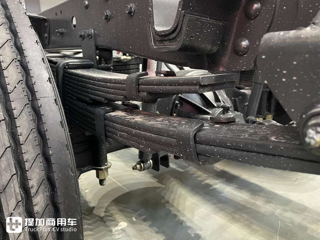 在承载方式上可根据用户需求选择多片簧和少片簧,实拍车型配备的是一个多片簧的悬架,采用前3后6+7片的搭配,适合进行大吨位散货运输。