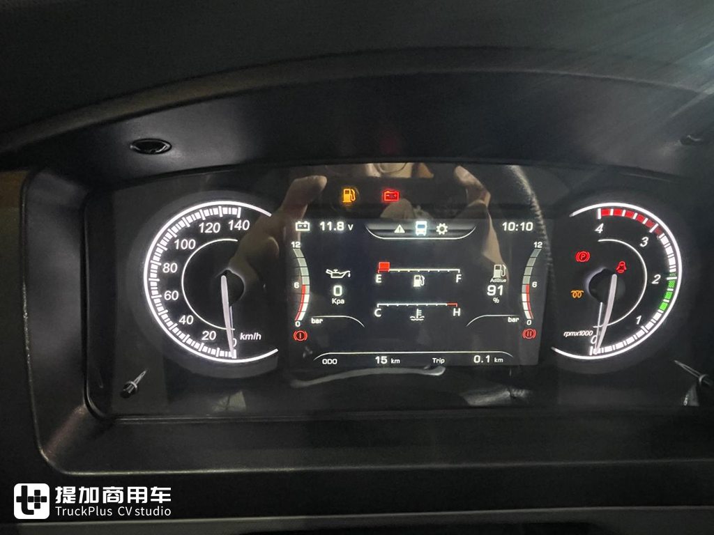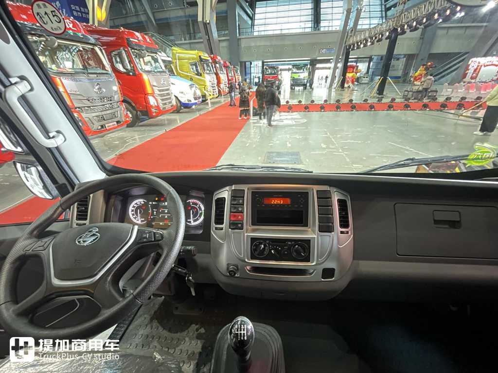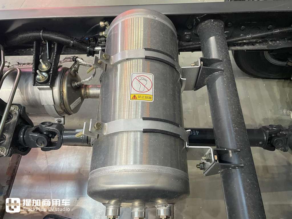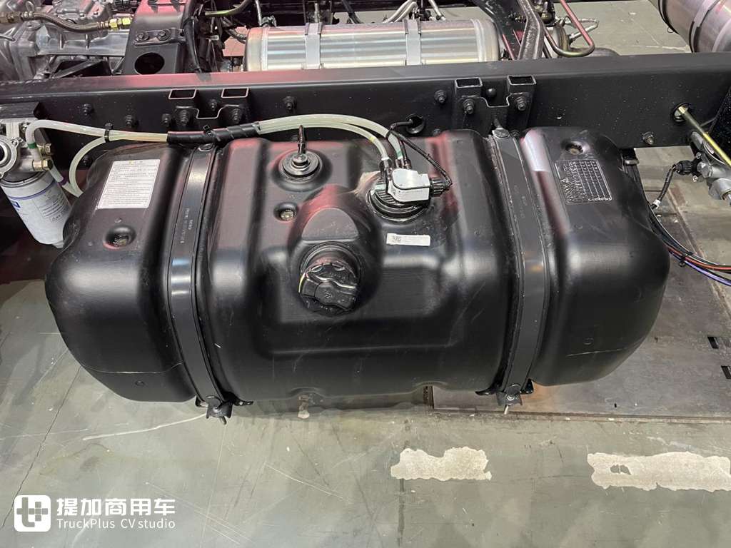 这辆展车的油箱是一个塑料材质的,容量为120L,针对城配或中短途可以有一个不错的续航能力。其材质采用高密度聚乙烯制成,强度足够,卡友们也无须担心其质量问题。