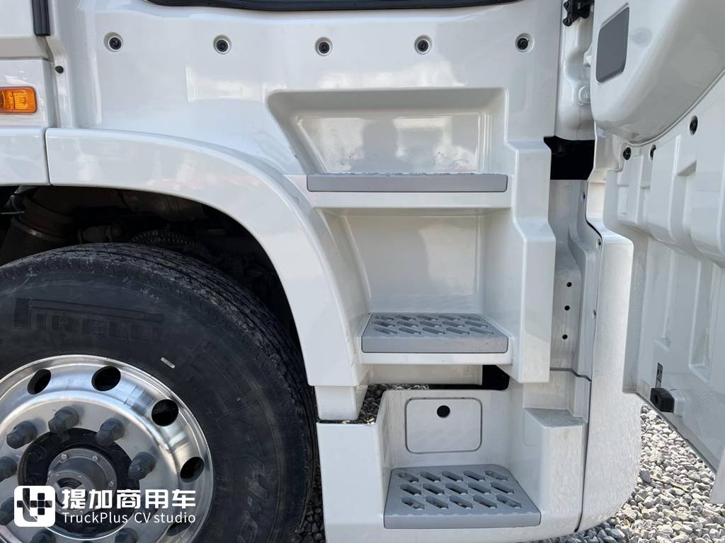 虽然天龙GX是一辆平地板车型,但是上车却毫不费劲,间距合理的三阶踏板宽度适中,上面带有镂空孔也可以避免鞋上的泥土带进驾驶室,而且踏板使用的是铝合金材质,耐久性会好一些。