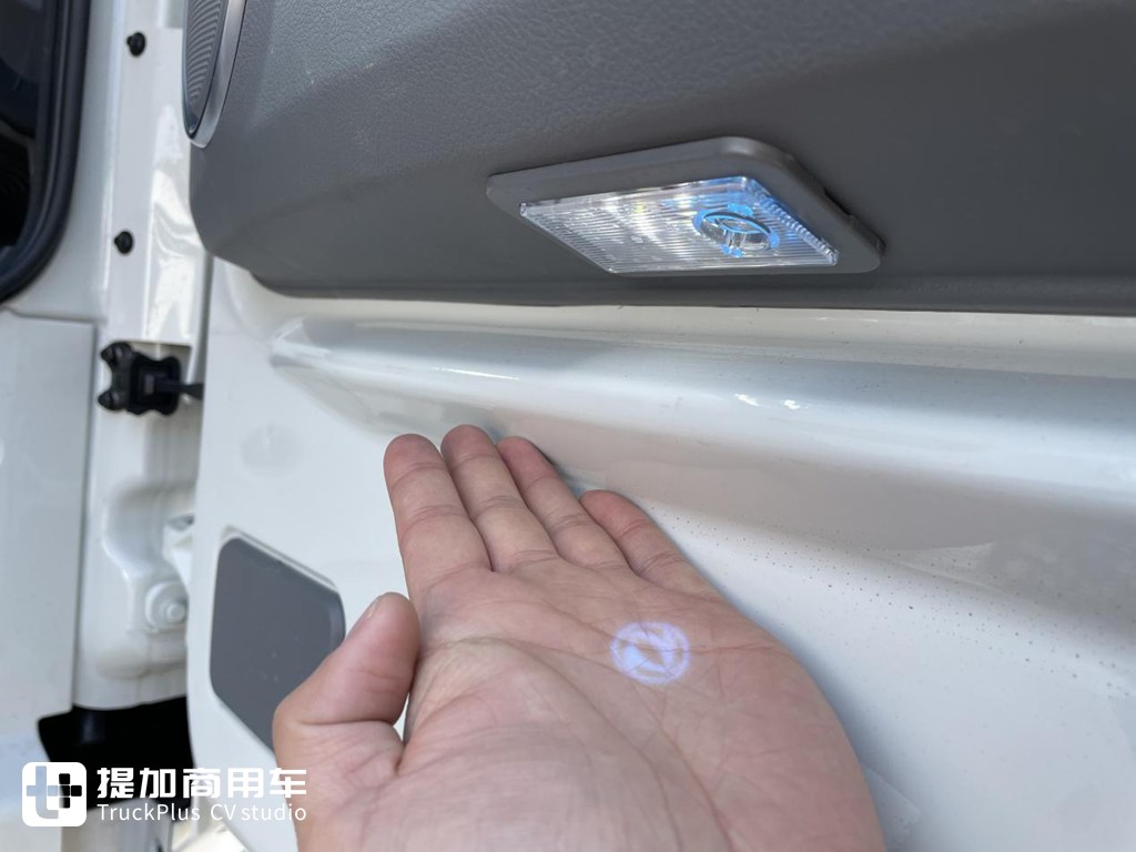 在天龙GX上还有许多小细节,就好比车门上的迎宾灯,打开车门之后迎宾灯会自动亮起,向地面投影出东风的双飞燕LOGO。