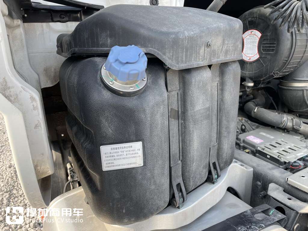 底盘布局紧凑,为了提高空间利用率,东风天龙GX的尿素储存箱便布置在了油箱的上方,采用了一个铝合金材质的平台进行固定。
