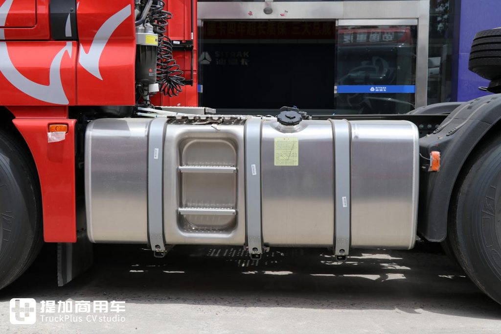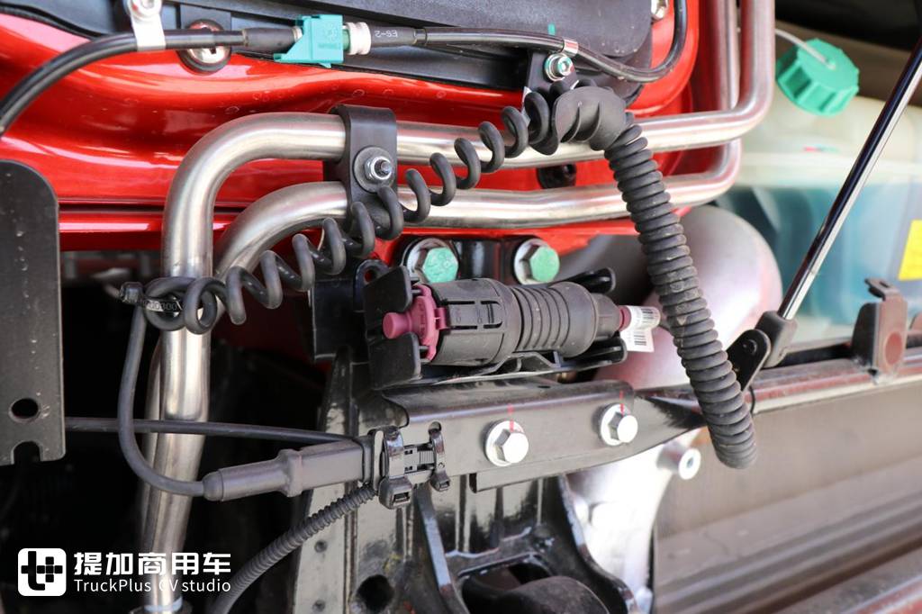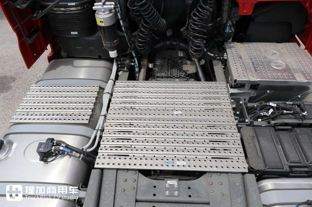 车辆采用双油箱的设计,780L+220L的油箱容量可以满足大部分热门长途路线的续航要求。车辆的电瓶为竖置堆叠,后处理也是简化式的,目的都是增加大梁的利用率。