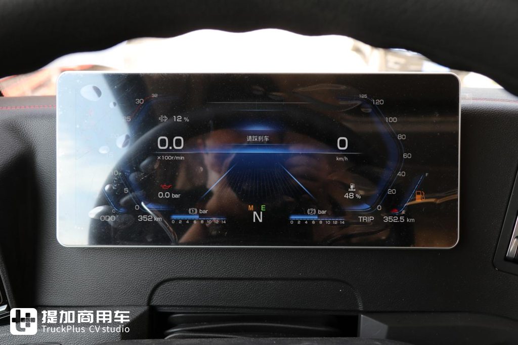 智能化是汕德卡C9H的一个主打项,在这辆车的液晶仪表盘上不仅有超多且详细的行车数据显示,内部还融入了车联网和行车助力功能,带有全方位的智能保养和服务提醒,驾驶员可以从这块屏幕上获取到超过90%的车辆信息。