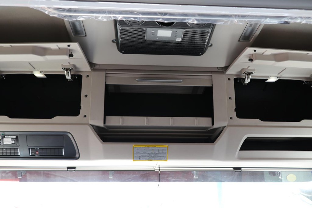 驾驶室顶部储物空间,这个水平基本上是够用的,两侧是大储物柜是合页式开门,中间是卷帘式,内深较大,配有内部照明灯。