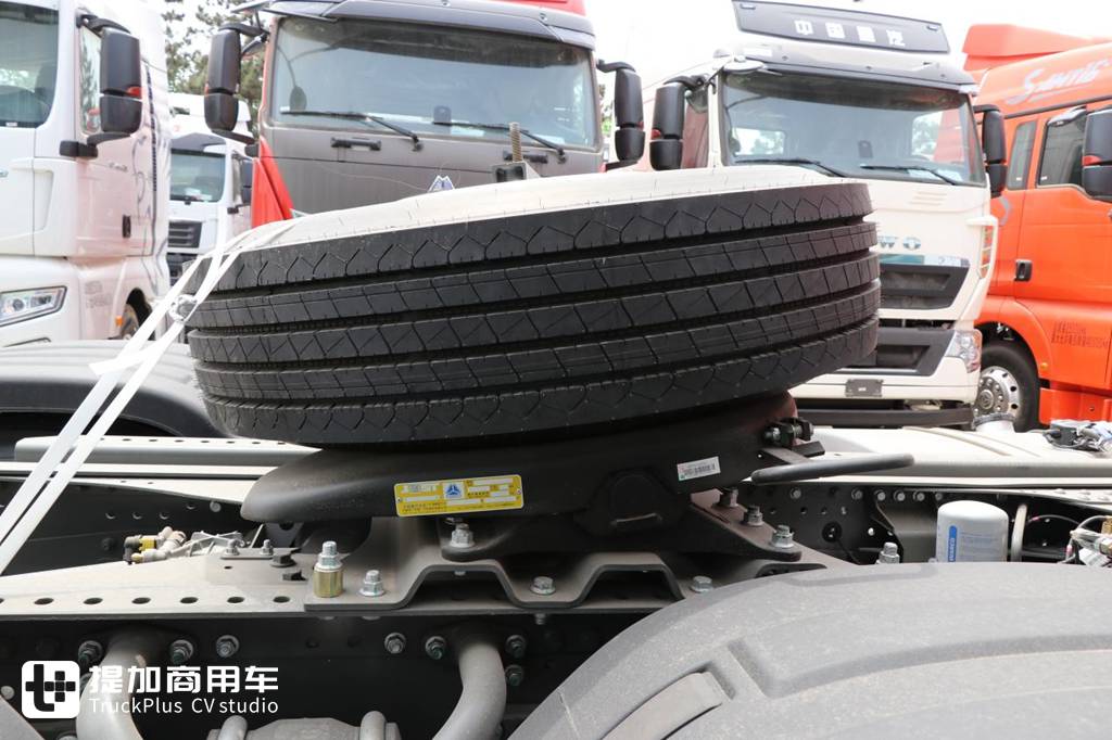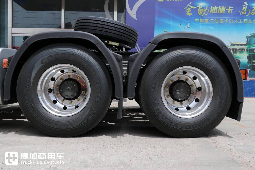 全车的固特异12R22.5轮胎和闪闪发亮的铝合金轮毂也能看出汕德卡C9H超高的定位,长途干线版车型的悬架为轻量化的少片簧钢板悬架,钢板片数为前2后3。