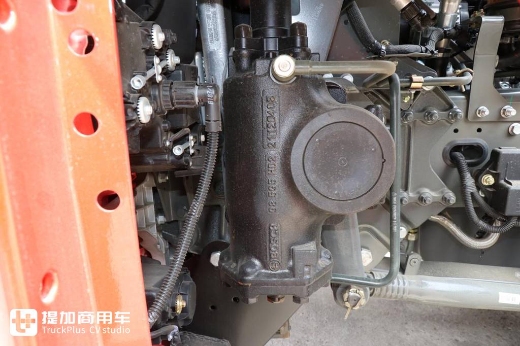 三大件过后接着说一下附件,其实相比于先前车型,汕德卡C9H底盘上还有一个很大的变化就是方向机,全系标配博世BOSCH方向机,力反馈效果更好,高速行车时方向会跟随车速逐渐变重,拥有更好的路感。