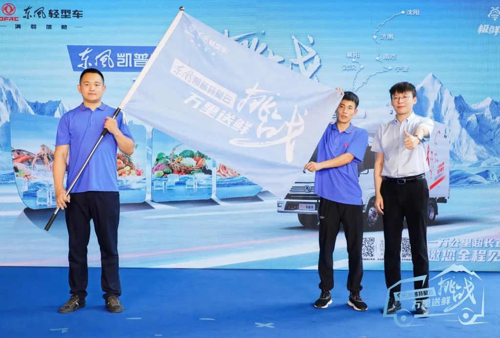 6日上午,“东风凯普特星云·挑战万里送鲜”活动正式开启。东风汽车股份有限公司总经理助理、商研总部总部长张晶峰莅临活动现场。在礼炮、彩花营造的浓浓氛围感中,东风汽车股份有限公司营销总部副总部长、党委书记熊继海,沈阳正轩汽车销售服务有限公司总经理吴连荣,亲自为小明、王哿以及他们的“战车”,挥舞起象征胜利的出征旗帜。