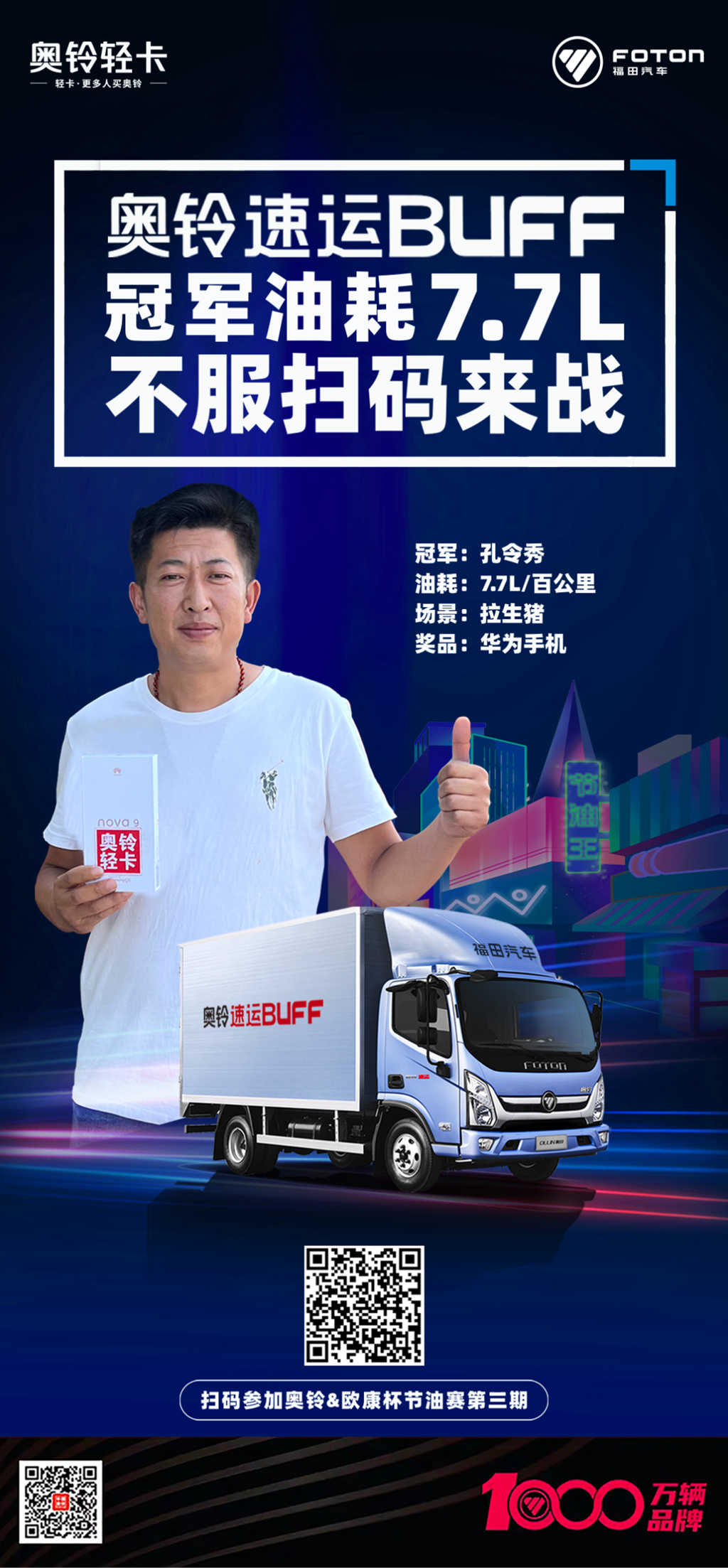 经过近一个月的激烈角逐,奥铃&欧康杯2022线上节油挑战赛二期落下帷幕。来自山东临沂的高师傅在众多选手中脱颖而出,以百公里油耗7.7L的优异成绩获得“节油BUFF冠军奖”。高师傅说:“此次参加比赛就是日常运营顺带着的,没想到还赢了个华为手机,挺不错的。其实说直白点,货运运营之道,就在于能省会赚,日常运营节油也是门学问。”