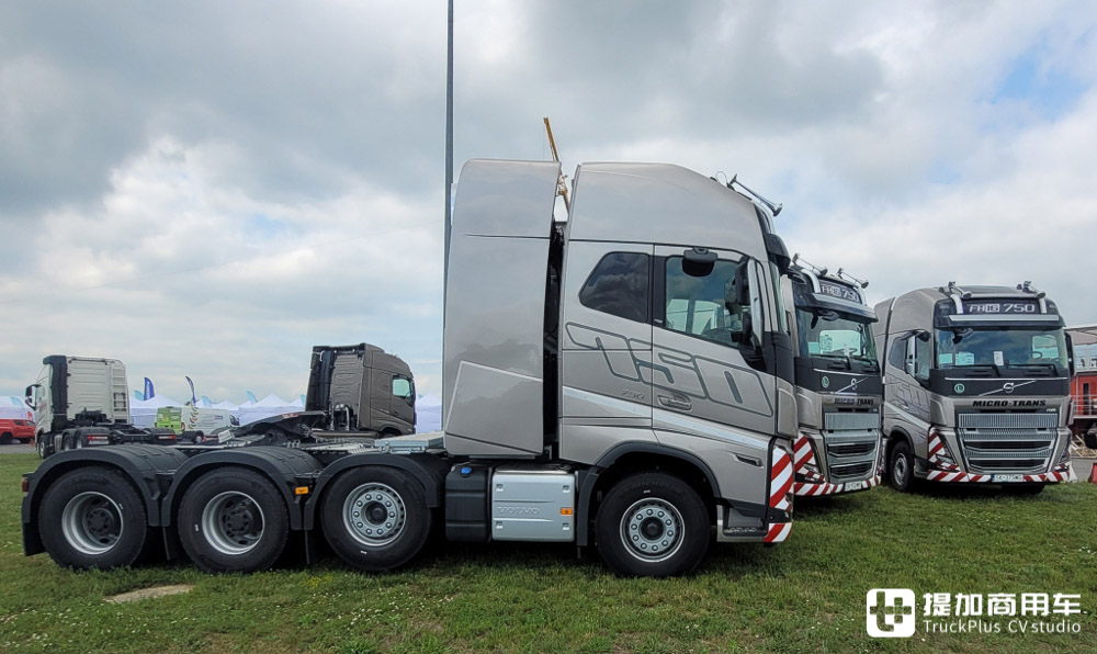 重量级选手看完,接下来还是三位重量级选手:基于新一代沃尔沃FH16 750发展而来的8x4大件牵引车。这三台大件牵引车将交付给Micro Trans公司,选配了原厂的驾驶室顶部灯架。前面罩上的绿色L标代表这是一台较为安静的卡车,能够满足更严苛的噪音限制。