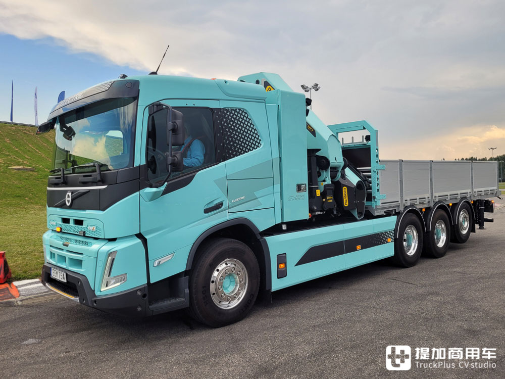 新FH 6x2底盘改装的随车吊运输车,配备了帕尔菲格生产的折叠式随车起重机。随车吊后半部分为平板载货区,这种配置在欧洲也比较常见。