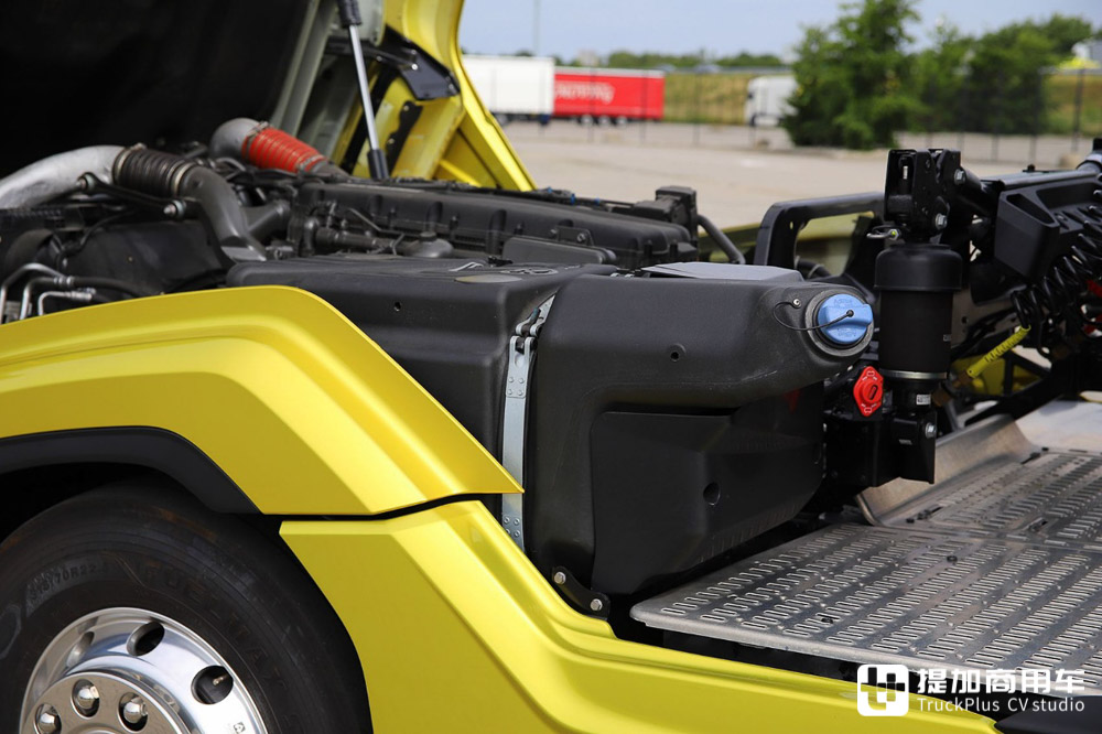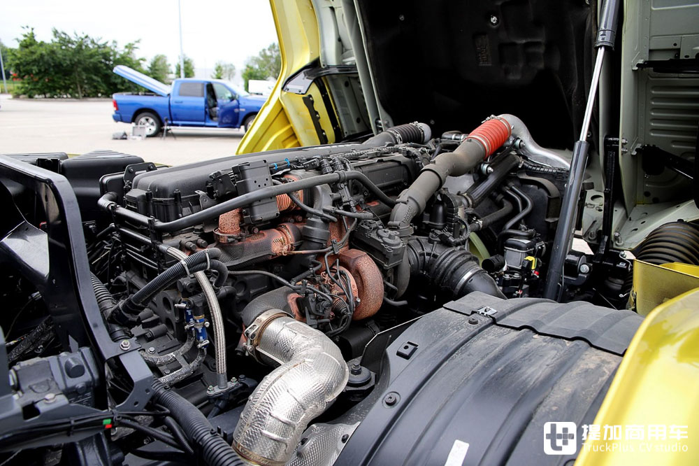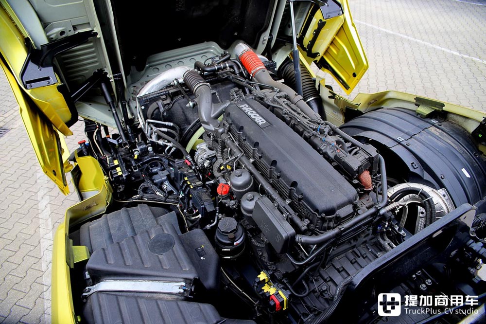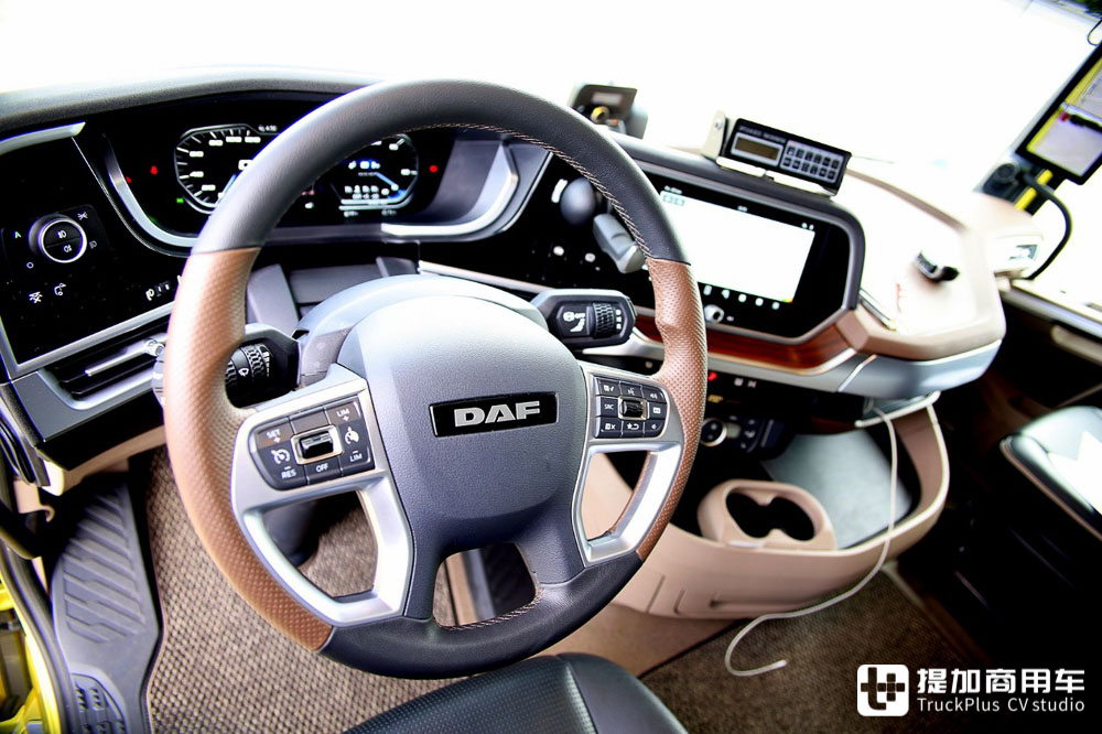 本台测试车采用480匹马力、2500牛米版本的佩卡MX-13发动机,匹配12档采埃孚TraXon变速箱。新一代达夫卡车对发动机的活塞、燃烧等进行了优化,再搭配久经考验的TraXon变速箱以及2.21速比的后桥,动力链的效能是十分不错的。