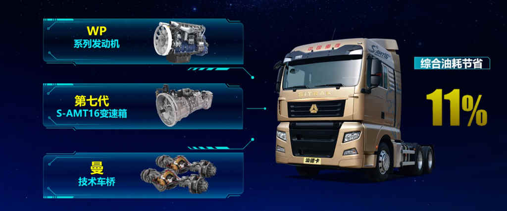 车辆搭载的WP14T发动机是全球首款热效率突破51%的柴油机,由潍柴为中国重汽专属定制,以全球领先技术实现整车动力性能的大幅提升;配合由中国重汽自主研发的第七代S-AMT16变速箱,通过空档滑行功能和驾驶行为优化等智慧功能,实现智慧节油、智能操控,无论新手还是老司机,怎么开都省油;采用国内唯一自带油滤器的小速比曼技术后桥,以超高传动效率实现高效节油。高效专属动力链配合超低风阻驾驶室,将体系化节油的优势发挥到极致,综合节油11%。
