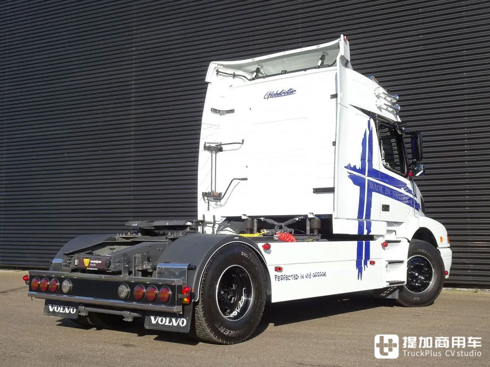 车辆整体涂装较为简单,以白色作为车身基础色。在驾驶室侧面呢,带有大大的瑞典国旗十字喷涂,并在上方带有“Made In Sweden“字样。在驾驶室后壁上,带有花体的”Globetrotter“字样,代表车辆的驾驶室。可以看出,车主确实是个沃尔沃资深车迷。