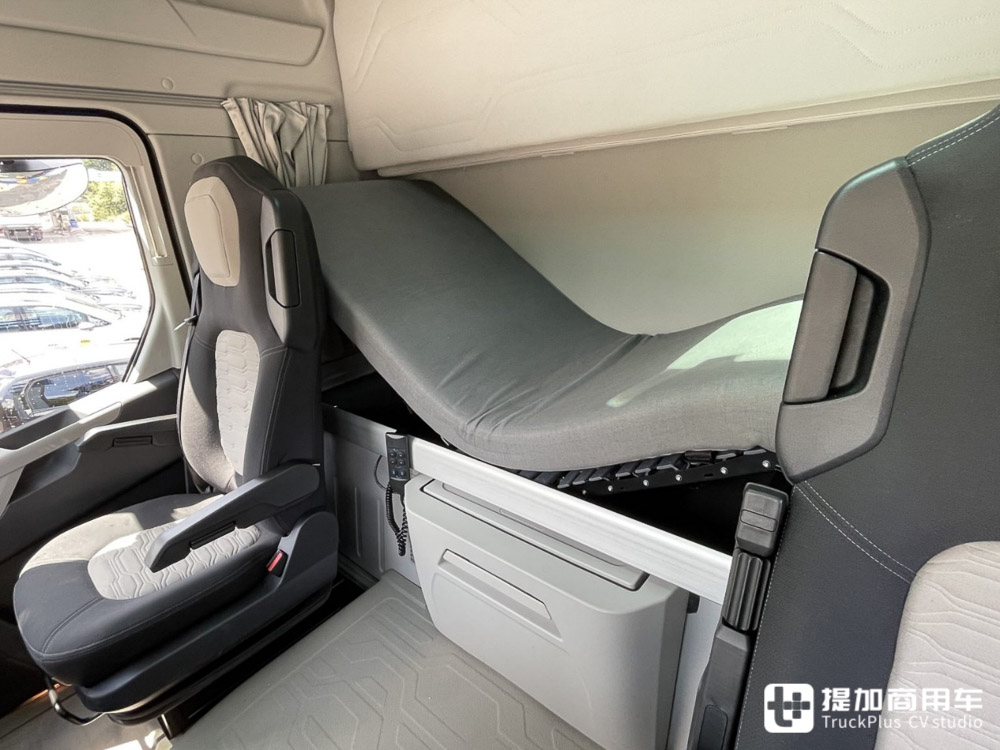 还记得达夫新一代卡车上那个非常舒适的电动可调节卧铺吗?现在福特卡车也有了。在德国市场销售的F-MAX牵引车如今可选由Eloisa公司提供的电动卧铺选装件,该系统通过调节卧铺下方的支撑,来将卧铺床垫塑造成各种各样的形状。