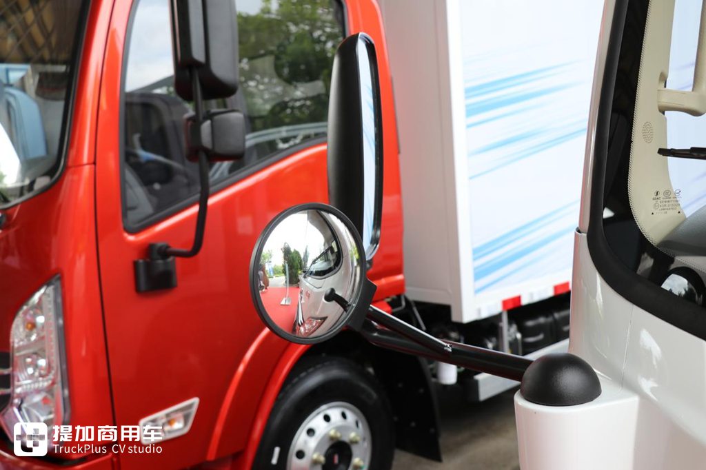 陕汽轻卡X1小卡并没有像其他的轻卡一样配备门式后视镜,采用的是小卡中较为流行的外摆镜,并为其配备了圆形前补盲镜,驾驶员在驾驶过程中用眼睛余光就能观察到左右镜片。
