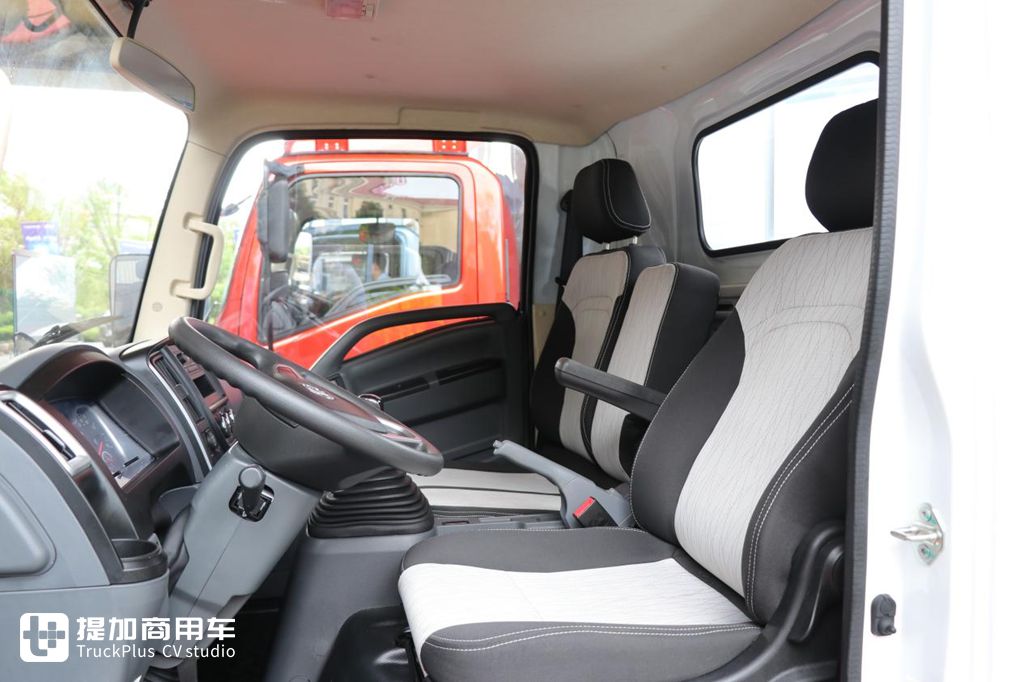 车内主驾驶座椅选用包裹性较好的座椅,腰部凸起支撑,侧面带有扶手,提升了小卡车型的驾乘舒适度。中间的座椅也没有像其他小卡车型一样设计成与副驾驶座椅连体的靠背,陕汽轻卡X1小卡的中间靠背是可以翻下来当做副驾驶的扶手来使用的。