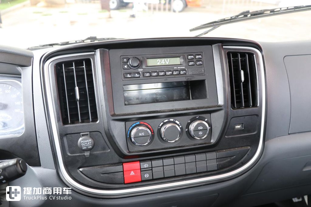 工作台为对称式造型,上面集成了多媒体收音机、储物盒、空调面板、功能性按键、24V 10A取电口和USB接口,操作简便,功能性丰富。