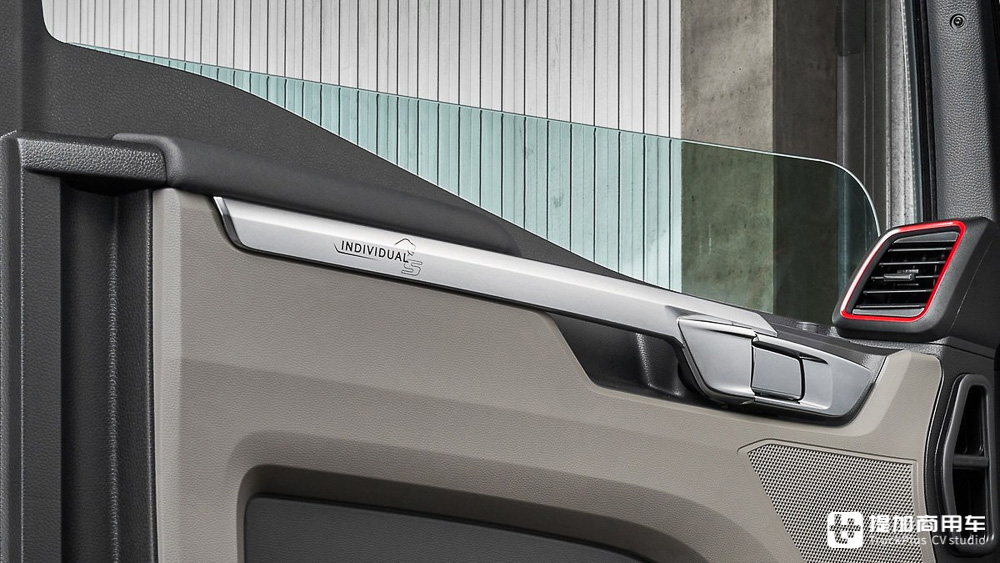 车门把手以及上方的装饰条都采用了金属材质,增强耐用性和视觉效果。装饰条上带有Individual Lion S的定制logo,用于凸显自己的身份。从这张图中也能看出,车辆配备了采用红色线条装饰的空调出风口,和TGX车型的定制版本保持一致,视觉效果极佳。