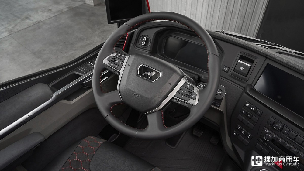 在驾驶室车门饰板上,备受欢迎的曼恩EasyControl控制按钮被保留了下来。该套系统包含四个纵向布置的按钮。除了固定的发动机启停按钮以及双闪灯按钮之外,剩下两个按钮可以根据客户的需要进行编程,实现不同的功能操控。现在有不少国产厂家也在跟进这项设计,有助于降低驾驶员的工作强度。