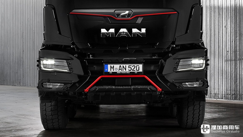 上图便是曼恩本次带来的两台TGS Individual Lion S车型的其中之一,它的车型为TGS 41.520 8x4 BB CH。该车采用升级版D26发动机,具备520匹马力。8x4驱动,搭配Miller Kipper打造的三向自卸上装。全身黑化的涂装再加上穿插在其中的细红线车身装饰,让每个男人看了都欲罢不能。在本期文章中,提加就为您来解析一下该车的设计亮点。