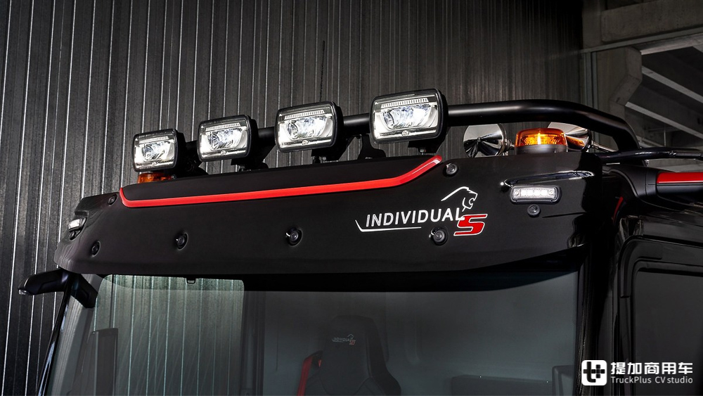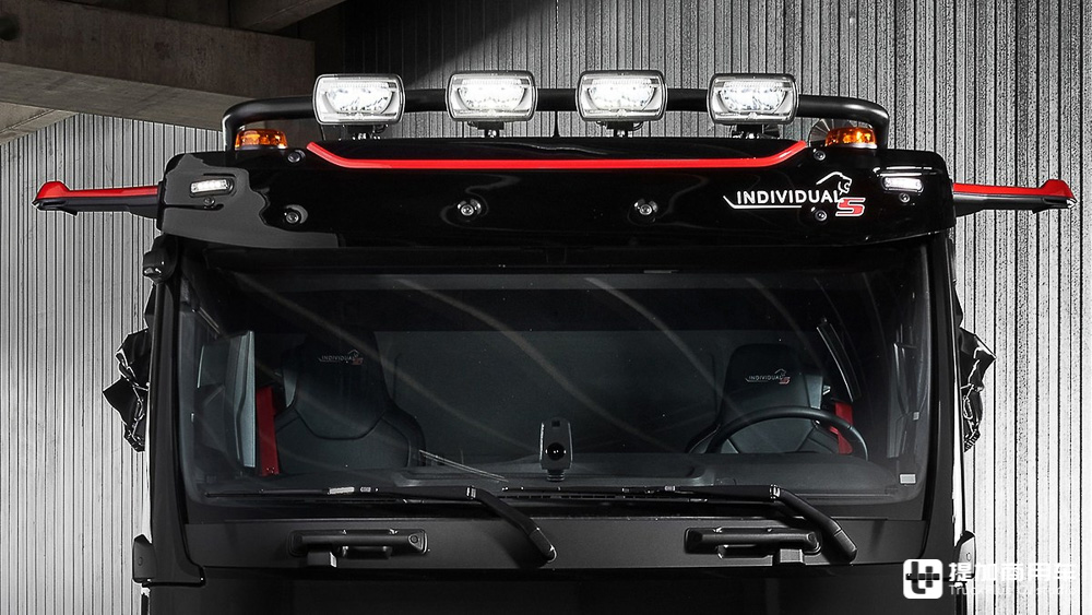 车辆在前挡风玻璃上方安装了遮阳板,遮阳板上也带有红色线条装饰以及曼恩Individual Lion S的专属LOGO。此外,还有两枚LED照明灯,增强视觉效果。这一遮阳板基于标准的遮阳板定制而来。想要了解它的定制过程吗?欢迎回顾我们之前走进Individual定制部门的文章。