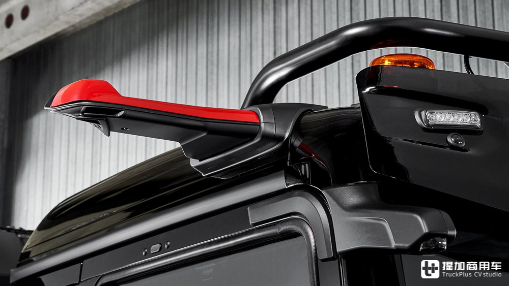 车辆的整体都被熏黑,包括车门侧面的型号表示以及固定在驾驶室轮廓上的扶手等细节之处。并且,车辆的Aerodomes空气导流套件也进行了黑色喷漆。