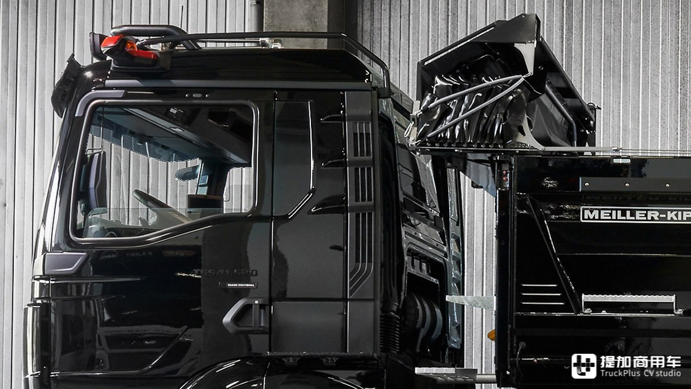 车顶安装有灯架以及四枚LED探照灯,两枚旋转告警灯,是十分标准的工程车辆配置。车载灯架采用熏黑设计,并附加有气喇叭。根据曼恩官方的消息,如果不想要熏黑灯架的话,也能换装成闪亮的镀铬灯架。