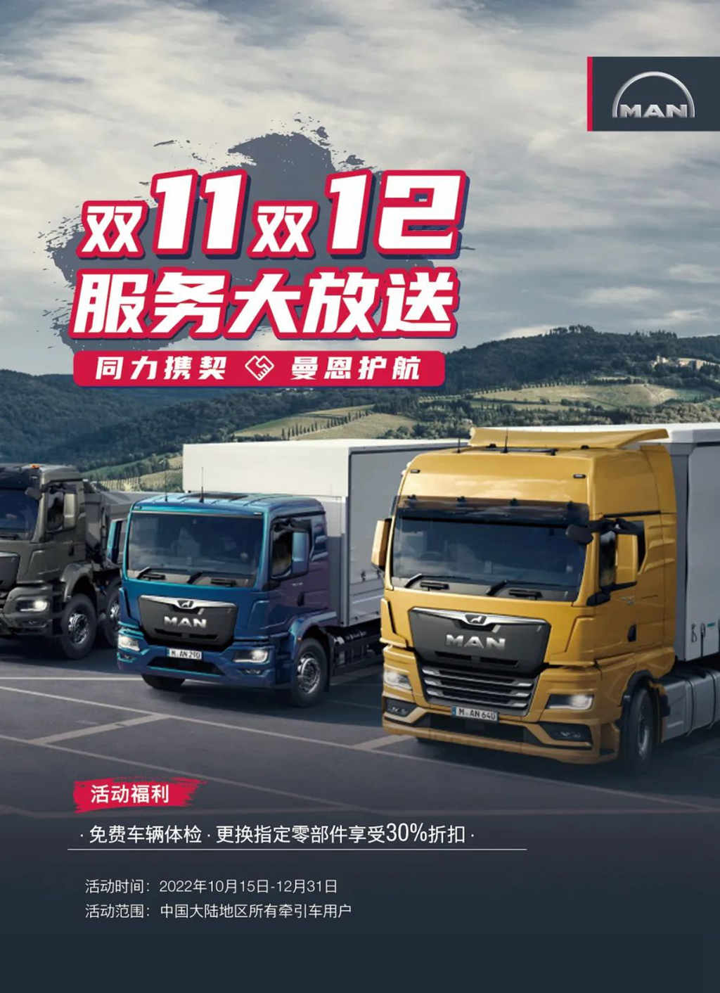 曼恩2022年度“双十一、双十二服务大放送活动”现已正式启动。详细的曼恩经销商联系方式与本次参与活动的配件详细清单,均可通过曼恩商用车中国官方微信号查询获悉。“客户至上”是曼恩一直以来秉持的服务理念,在运输行业面临诸多考验的行业环境下,曼恩致力于成为客户可靠、安心的伙伴,为您在即将来临的寒冷冬日带来温暖服务,助力本土物流运输实现高效发展。