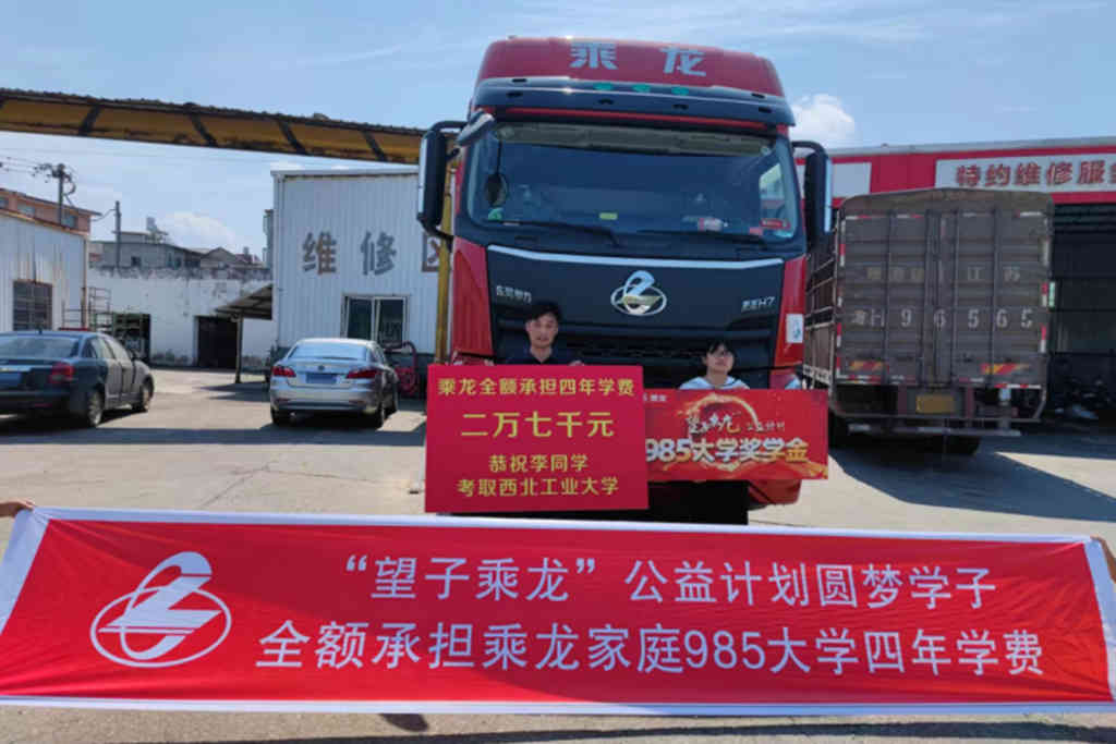 2022年,乘龙在67品牌客户日上推出了“望子乘龙”第二季公益计划,考上并入读985高校的乘龙卡友子女;东风柳汽全额承担大学本科期间学费,参加高考或中考,并被大学或高中录取的乘龙卡与子女,获得奖学金支持;为全国100个重卡村小学,捐赠一批文教体育器材,让孩子们在学习之余尽情享受童年乐趣。
