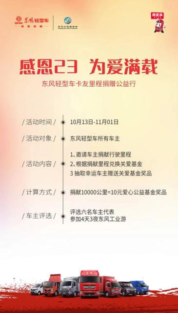 “感恩23,为爱满载”东风轻型车公益行活动自10月13日开启,每位东风轻型车车主可以通过线上报名的方式参与,捐献自身的行驶里程。每位参与到活动中的东风轻型车卡友,更有机会抽奖获得油卡、华为智能手机、化妆品、学习机等多项大礼,用以孝顺父母,关爱妻子,呵护孩子,真正让每位卡友师傅实实在在把爱带回家,让爱和欢乐传递给身边最亲密的人。