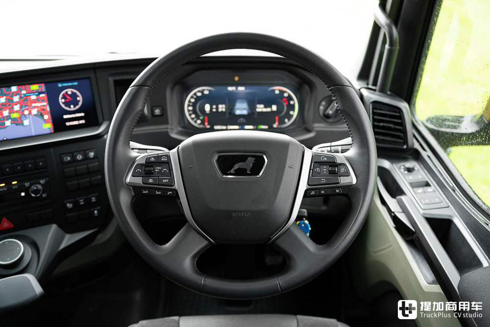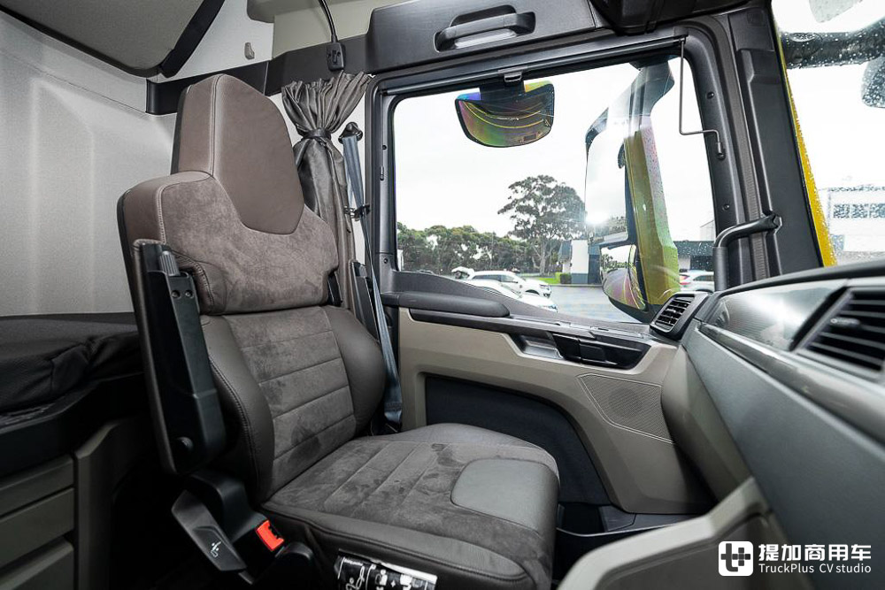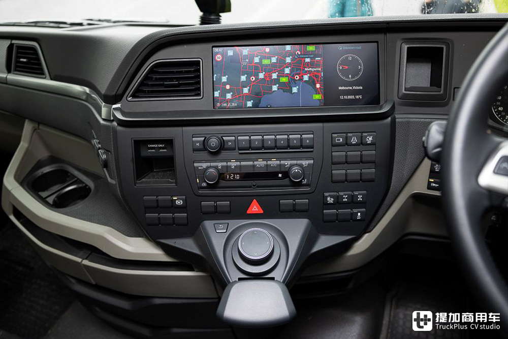 澳大利亚采用右舵驾驶,这台TGX因此也被设计成了右舵。不过,仪表台设计基本是没有发生变化的,依旧是环抱式仪表台,角度偏向驾驶员,便于操控。新加入的全液晶仪表盘和触摸多媒体屏幕,也没有缺席这台TGX。