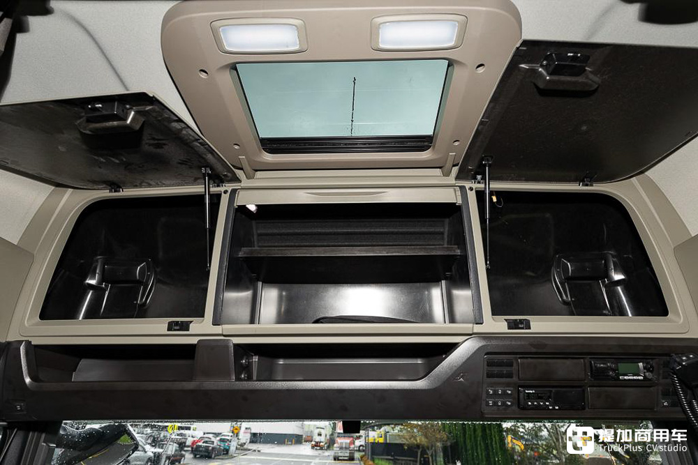 得益于高顶驾驶室的布局,这台TGX在车顶设计了三个大尺寸储物柜。左右储物柜门为上翻设计,中央储物柜门为卷帘设计,整体更方便使用。此外,还可选装原厂的大功率逆变器,这样就能够安装原厂微波炉、咖啡机,乃至是电视等配置。