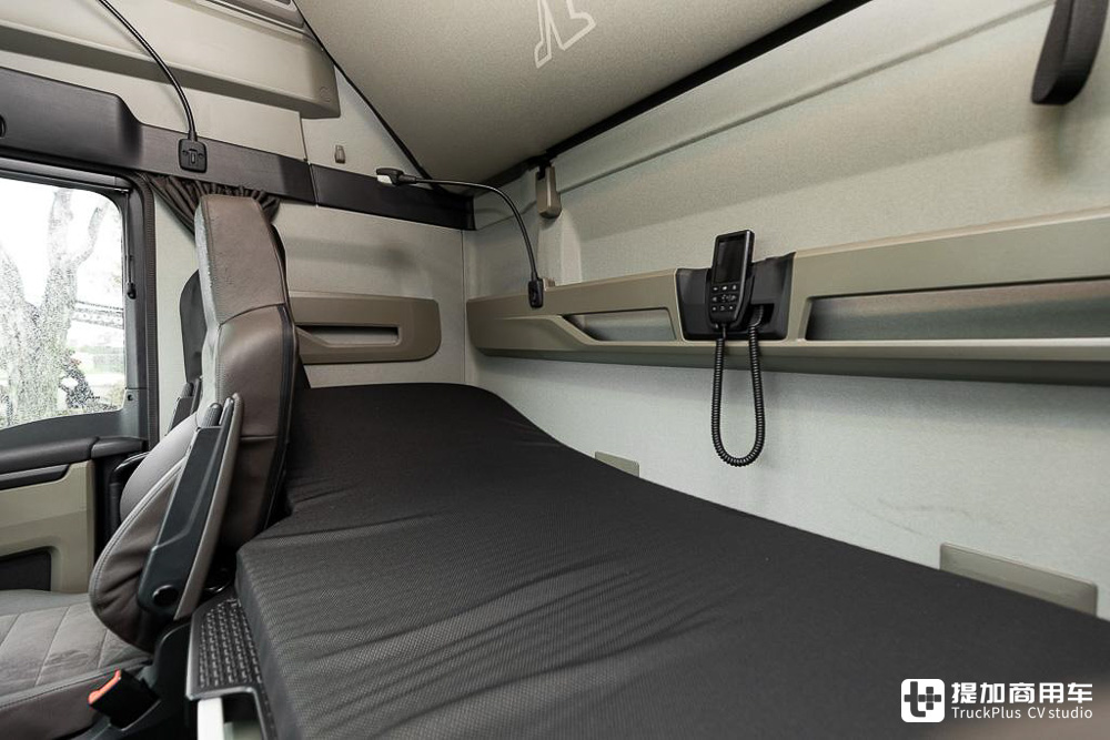 后床采用上下双卧铺设计,下层卧铺床垫厚度为160毫米。此外,卧铺区域设计了侧壁储物格、控制器、阅读灯等配置。并且,下层卧铺可以对卧铺进行多种调节,例如头部高度等,让驾驶员能找到更舒服的睡眠姿势。