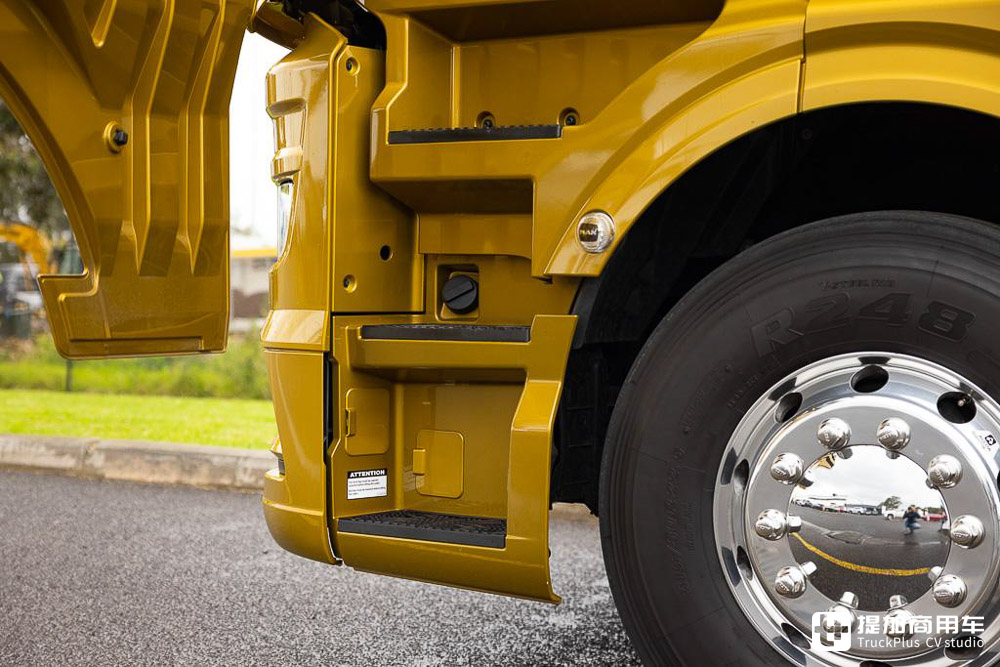 澳大利亚地广人稀,公路列车运输时很难在沿途找到加油站。因此,车辆配备了左右双油箱。右侧小容积油箱能够提供460升燃油,而左侧的大容积油箱能提供620升燃油,并融合了登车踏板配置。此外,底盘右侧还安装有后处理系统,其带有挡板,还可见挡板上方的禁止踩踏标识。