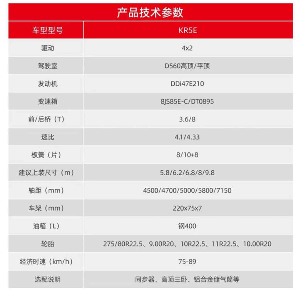 而另一款参与的车型,则是卡友们非常熟悉的一款中卡车型,东风天锦KR。该车搭载满足国六b排放的龙擎DDi47E210-60柴油发动机,发动机排量4.75L,最大可输出210马力,最大扭矩750N.m。该发动机经济节能,耐用可靠,属于东风商用车全新开发的国六龙擎发动机系列产品,通过市场验证,深受用户好评。匹配的是法士特8JS八挡手动变速箱,业内俗称“小八挡”,可靠性高,体积小、重量轻,齿轮优化设计,啮合平稳,噪音低。整车在具备了不错的燃油经济性下,还能广泛适应绿通、散杂、快递、快运等细分市场,可谓是“一专多能”。
