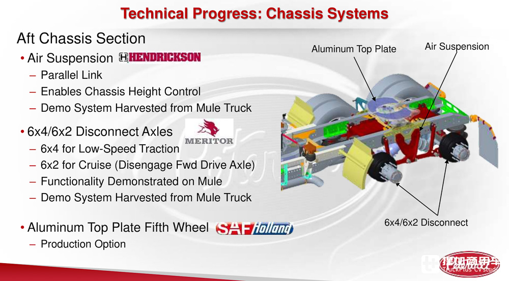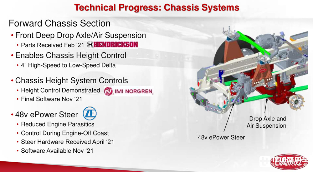轻量化车轴由瀚瑞森提供,采用空气悬挂,带有高度调节功能。当车辆在高速公路巡航时,能够调低离地间隙,进而减小空气阻力。车辆的转向采用采埃孚提供的电子转向系统,借助车载48V电池工作,即使发动机关闭也能轻松打方向盘。