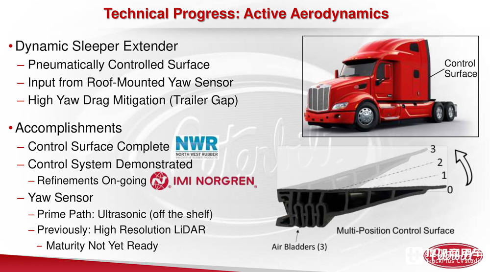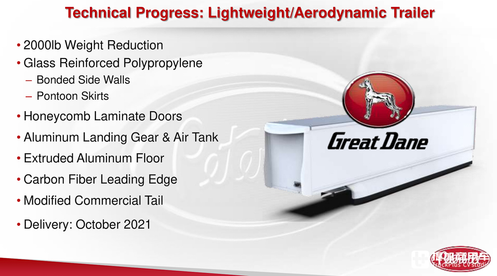 在挂车方面,彼得比尔特和GreatDane合作,开发了一款适配于Super Truck 2挂车。该挂车采用铝制车架、支腿及储气罐,侧墙采用玻璃纤维材质,并且边缘、后门等地采用了多种不同的轻量化材料,整体减重高达2000磅。