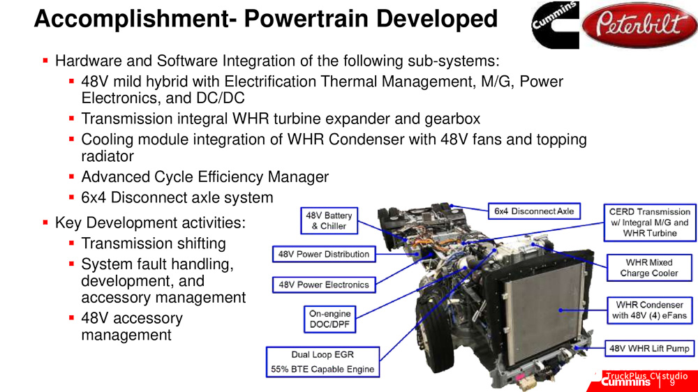 并且,车辆的发动机还采用了48V电子风扇,提供更精确的热量管理。轻混系统带有动能回收功能,降低刹车时带来的动能损耗。此外,康明斯和伊顿一起为车辆开发了先进循环效率管理系统,以此保障发动机时刻处于最佳工作状态。在实际测试中,这套动力系统的热效率高达55%以上,是一个从未达到过的里程碑。