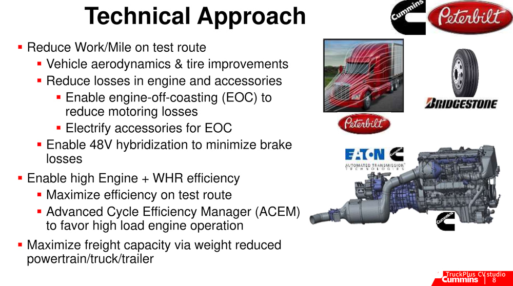 较短的轴距也是Super Truck 2的特点。车辆采用6x4的驱动配置,双后桥被隐藏在了侧裙之中。为了提高车辆的综合效率,彼得比尔特、康明斯、伊顿、普利司通等企业都参与了这项计划。车辆的发动机为康明斯X15型,变速箱来自伊顿。此外,车辆采用了48V电气架构,并集成了废热回收系统以及48V轻混系统,从废气中榨取能量。发动机采用双回路EGR系统,适配55%以上热效率的发动机。并且,DPF、DOC被集成至了发动机系统之上,为废热回收系统提供优秀的工作条件。