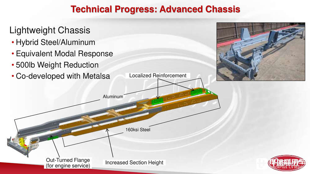 轻量化一直是美国卡车的强项,毕竟美国铝车架、铝驾驶室已经相当普及,轻量化这块一直不输。在Super Truck 2上,彼得比尔特和Metalsa为车辆设计了钢铝混合的高强度轻量化车架,减掉了500磅的死重。并且,其采用了变截面设计,为各项零部件的安装创造了便利。