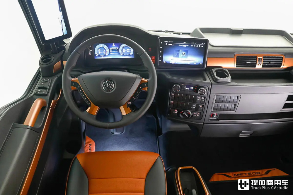 坐到驾驶位上,你就会感觉:大众Meteor和曼恩TGX的差别实在太小了,经典的方向盘和平直的仪表台设计让人一看就很熟悉。不过,这台Meteor Optimus采用了新设计的全液晶仪表盘,并增添了中控大屏,提升车内智能程度。方向盘以及仪表台上带有水转印饰板,同样采用了橙色。并且,车门饰板、地毯勾边等细节之处也有橙色加入,整车的橙色元素可谓比比皆是。