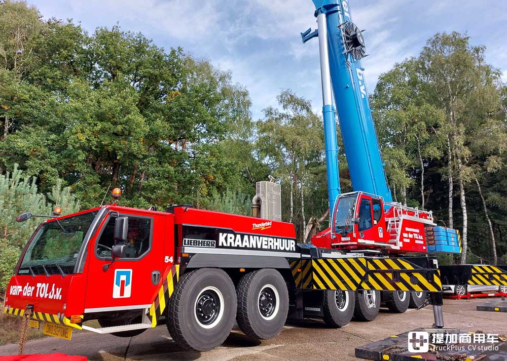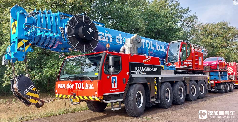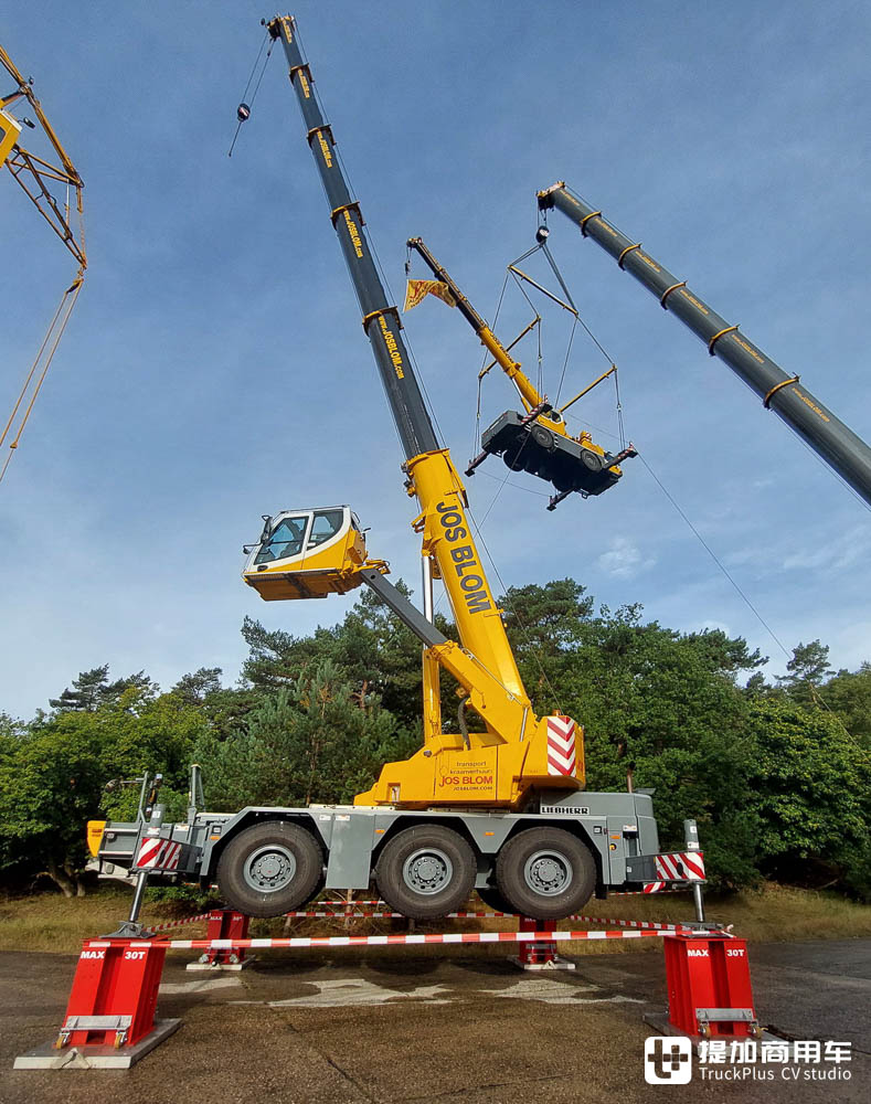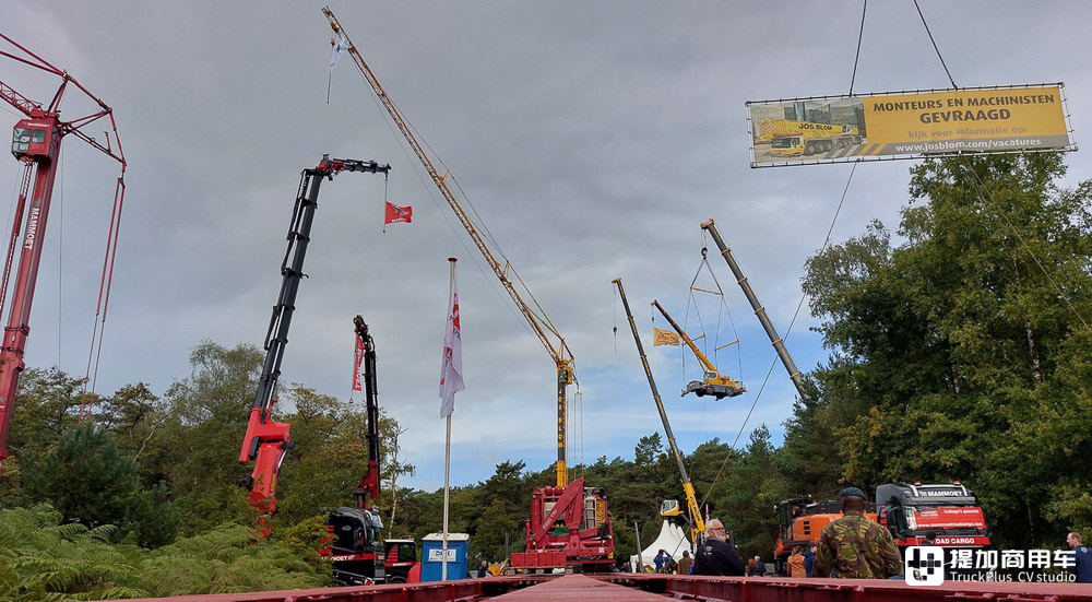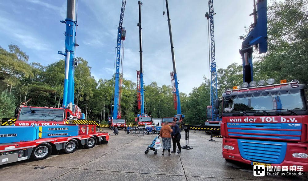 van der TOL b.v吊装公司旗下的两台全地面起重机也参与了这次展览。其中,还有一台起重机牵引了附加的挂车,挂车上带有起重机配重,甚至还有一台大众高尔夫。