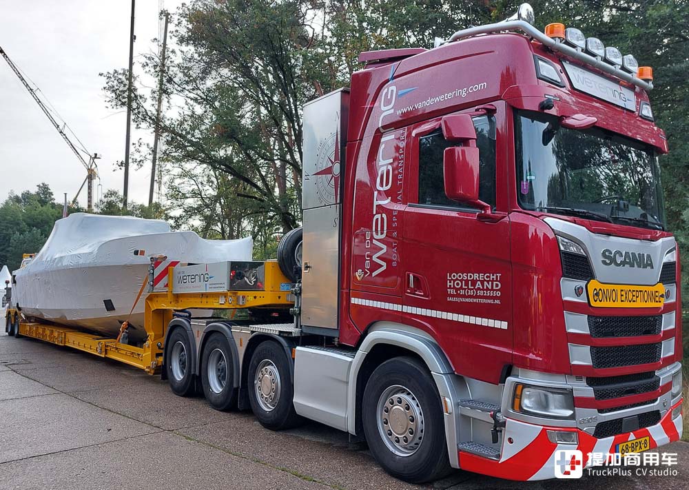 除了起重和特种运输之外,场内也有一些从事其他行业的企业。比如上图中的Van de Wetering公司,他们就专门从事于游艇运输。车辆的外观相当不错,并且他们还在前脸上打造了专属的CONVOI EXCEPTIONNEL标牌,与前脸融合的更加和谐。不过,这车的大灯有点起雾,美中不足。