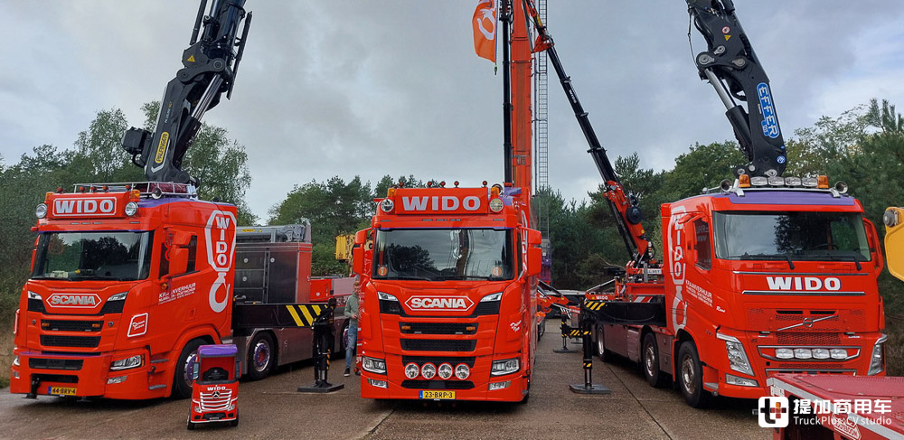 在一旁,是来自WIDO公司的三台卡车,分别为两台斯堪尼亚NTG底盘随车吊以及沃尔沃FH底盘随车吊。这家公司的主要业务是吊装,因此卡车驾驶室侧面的logo设计也以吊钩为元素。在卡车斜前方,还有一台奔驰Actros的车模,很有意思。