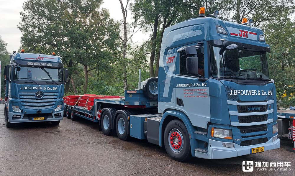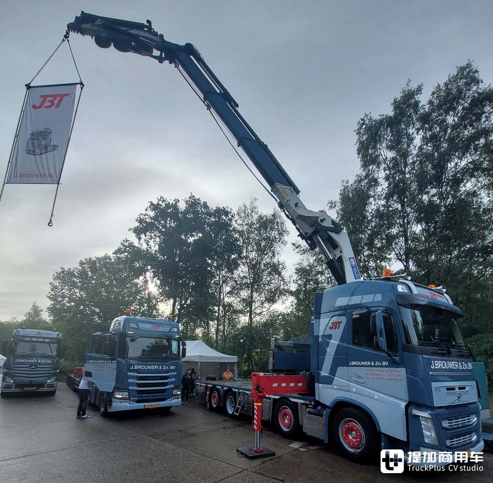 上图中的三台卡车都来自JBT运输公司。这家公司的主业亦为吊装。本次参展车型为一台奔驰Actros牵引车、一台斯堪尼亚R500牵引车以及一台沃尔沃FH随车吊。由于这些车辆经常出入狭窄的工地,因此它们的车顶都配备了旋转告警灯。
