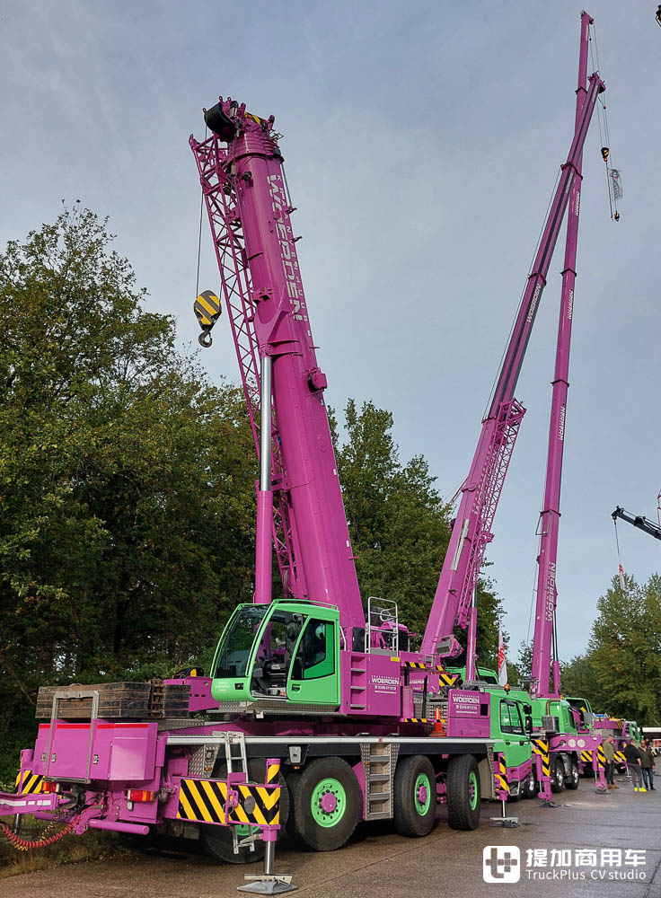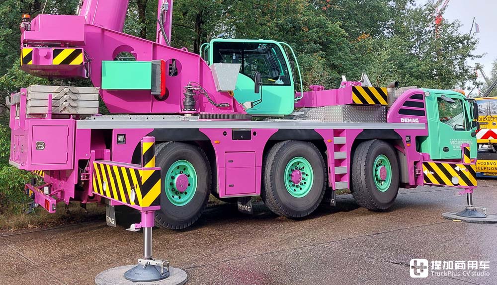 上图为两台来自WOERDEN公司的全地面起重机,它们分别由Grove和Demag制造。这些起重机采用了特殊设计的车轴和悬挂系统,具备蟹行、全轮转向等多种运动模式,提升车辆机动性。该公司独特的玫粉色涂装,也让这两台起重机在参展车型中脱颖而出。