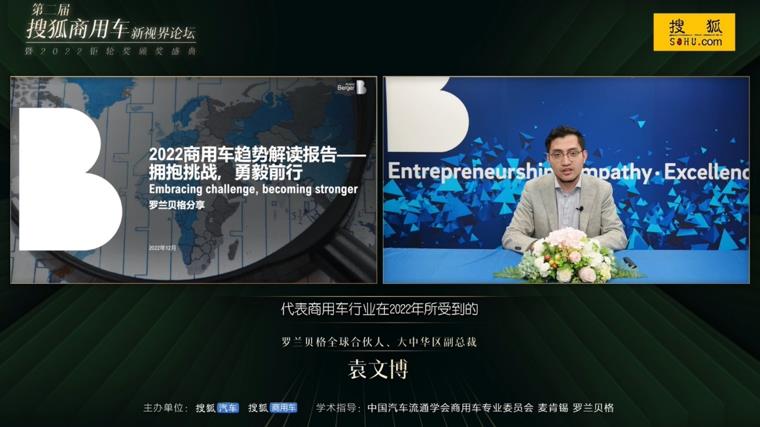 如今,商用车产业正经历着百年未有之大变革,尤其在智能网联和“碳达峰、碳中和”的双重背景下,行业发展迎来了很多挑战和机遇。2022年,中国商用车产业呈现出哪些特征,又有哪些发展趋势?罗兰贝格全球合伙人、大中华区副总裁 袁文博先生带来演讲《2022商用车趋势解读报告—拥抱挑战,勇毅前行》,该报告由罗兰贝格与搜狐商用车联合发布。