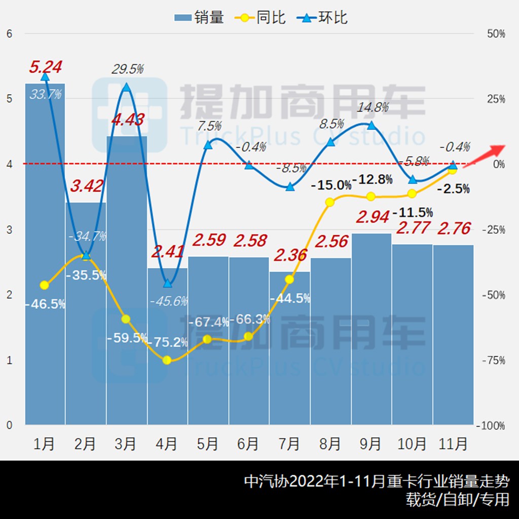 根据中汽协数据统计,11月份重卡市场(载货/自卸/专用车)共销售2.76万辆,整体依然保持开口向上的积极势头,其中:环比增速-0.4%与上月相差不大,同比增速继续爬升至-2.5%而刷新2022年最佳战绩,相较牵引类而言具有更强的御寒能力。